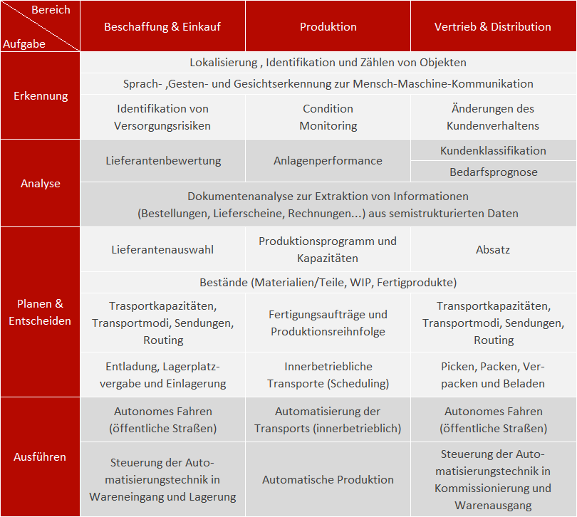 Das Modell orientiert sich an zwei Dimensionen. Zum einen an Aufgaben von ML-Systemen und zum anderen an Bereichen, in denen Transport, Umschlag und Lagerung von Gütern, Anlagen und Hilfsmitteln sowie die dazugehörigen Planungs- und Steuerungsaufgaben eine Rolle spielen. In Kombination der beiden Dimensionen ergeben sich Anwendungsfelder, in denen Maschinelles Lernen für effizientere Prozesse sorgen kann.